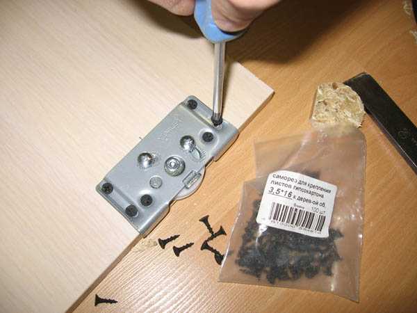 - На следующем этапе необходимо произвести установку роликов. Без ручной фрезерной машинки выполнить эту работу будет проблематично. Хотя зависеть это будет еще и от выбранной системы. Так, прикладываете ролик к нижней части ДСП, от края на расстоянии до 100 мм. Обводите его карандашом. На полученном эскизе необходимо вырезать посадочный паз. После в него монтируете ролики и фиксируете саморезами.