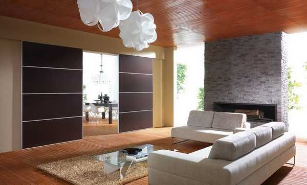 Если вам по душе этот вариант дверей, то стоит рассмотреть все за и против. Их существует несколько типов. Например, можно установить одно или два полотна, которые будут двигаться вдоль стены или в фальшь-стене. В таком случае можно будет изолировать отдельные помещения. Иногда двери могут состоять из нескольких подвижных полотен и неподвижных боковых створок. Чаще всего эти двери устанавливают с целью зонирования помещения.