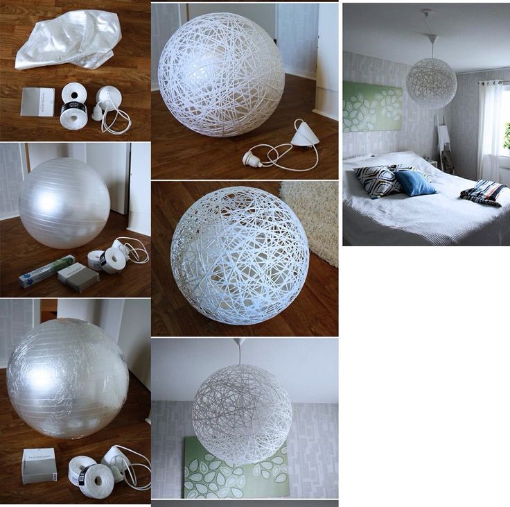 гамме внесет ярких акцентов в дизайн помещения. Сделать такую люстру несложно, достаточно иметь под рукой воздушный шар, клей и нитки. Шар надуть, обмотать бечевкой, поверх нанести клей. Дать изделию высохнуть. Сделать отверстие под крепление патрона. Вынуть шар, оформить на свое усмотрение;