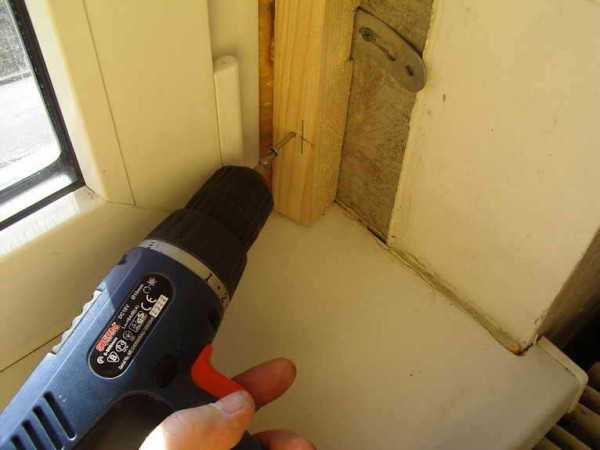 Для начала монтируется откосная конструкция из пластикового профиля, учитывая периметр окна. Чтобы откос был правильно сделан, его размечают отметками от штапика до края стены на равном расстоянии. Эти метки и являются платформой для установки стартового профиля, который крепится к раме саморезами с помощью шуруповерта.- Край откосного каркаса закрепляется обрешеткой, которая составляет деревянную планку. Она монтируется путем сверления отверстий и забивания дюбелей.