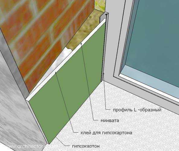 заранее замеренный и подготовленный кусочек гипсокартона крепится на откос саморезами;- участки с пустотами между гипсокартонным листом и стеной закладываются уплотнителем, который сможет обеспечить теплоизоляционные особенности и уберечь от влаги.