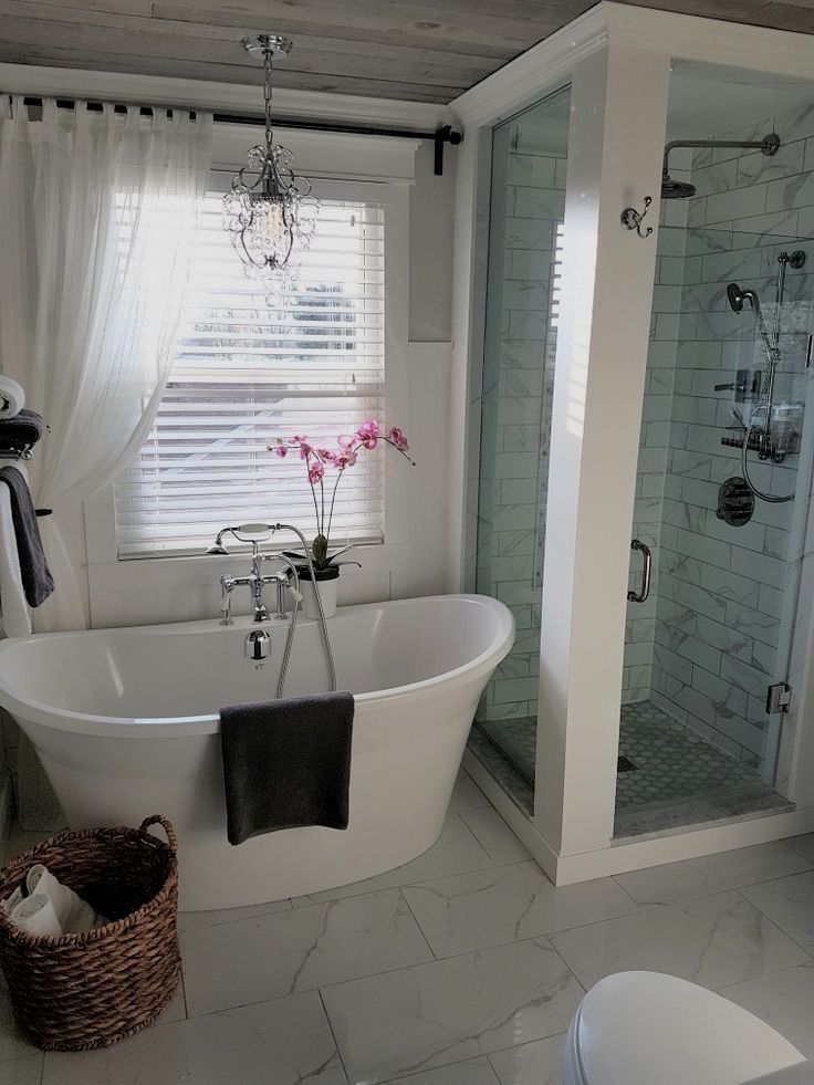 Установите джакузи или большую 72-дюймовую ванну в нише окна, выложите плиткой стены до нижней части окон и наслаждайтесь светом и видом во время купания.