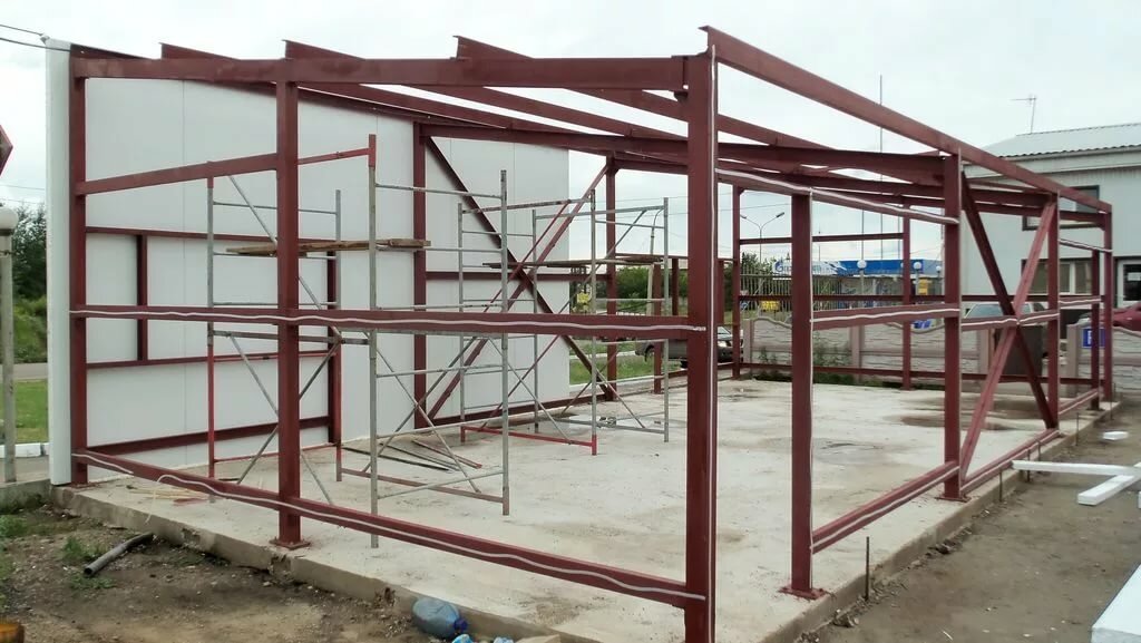 После установки каркаса, следует переходить к креплению сендвич-панелей.