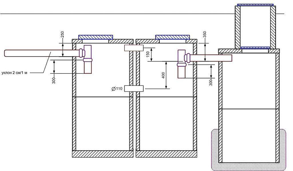 Также надо учесть, что точка перелива из одного резервуара в другой ниже точки входа на 20 см.