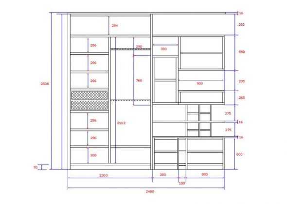 Определяем толщину полок, планируем выдвижные и подвесные элементы, дверцы.