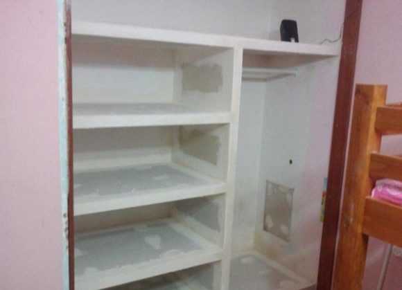 - После установки каркаса, обшиваем его листами гипсокартона. В углах и стыках гипсокартона необходимо наклеить молярную сетку с последующим нанесением шпаклевки. А после шкаф необходимо зашпаклевать, покрасить, придав ему прочность. Завершающим этапом вставляем полочки и штанги.
