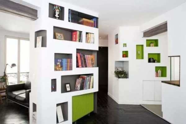 - Встроенный шкаф из гипсокартона прекрасно выполнит задачу зонирования помещения. Можно сделать даже стеллаж-перегородку посередине комнаты, разделив ее на две части. По поводу деревянной мебели такого не скажешь: оборотная сторона ее обычно хрупка, непривлекательна и малопригодна для дизайнерских целей.