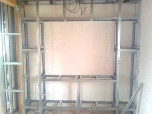 - Каркасом могут служить металлические профили и бруски из дерева. Более практичный вариант – это каркас из металлического профиля, потому что он не будет нести большую нагрузку на конструкцию. А для крепления направляющих для раздвижных дверей и других подвижных частей, требуются деревянные бруски, для обеспечения жесткости и прочности.
