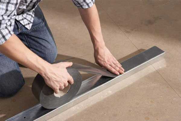 - Сначала устанавливаются профили, которые примыкают к поверхностям. Между ними необходимо выдерживать расстояние примерно в 400 мм. Крепление выполняется с помощью саморезов. Перед установкой на каждый элемент простилается демпферная лента – она глушит звуки. Без неё любое открывание шкафа будет отдаваться по всей квартире. Лучше клеить ленту на сами профили и потом их прикреплять к поверхностям. Если накладывать материал на стены, то можно нечаянно дать кривизну и впоследствии искривить всю конструкцию из-за неправильного монтажа.