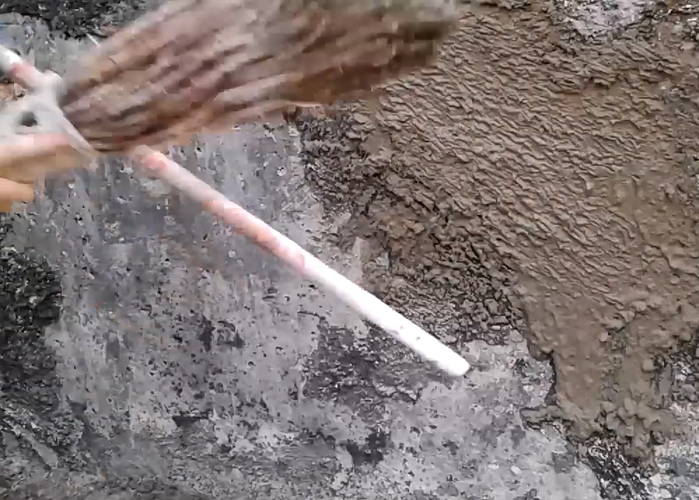 Для этого необходимо использовать раствор, веник и палку. В одной руке держим палку, в другой веник. Вымачиваем веник в растворе и бьем по палке, которую держим напротив стены. В результате этого раствора распределяется по поверхности дома.