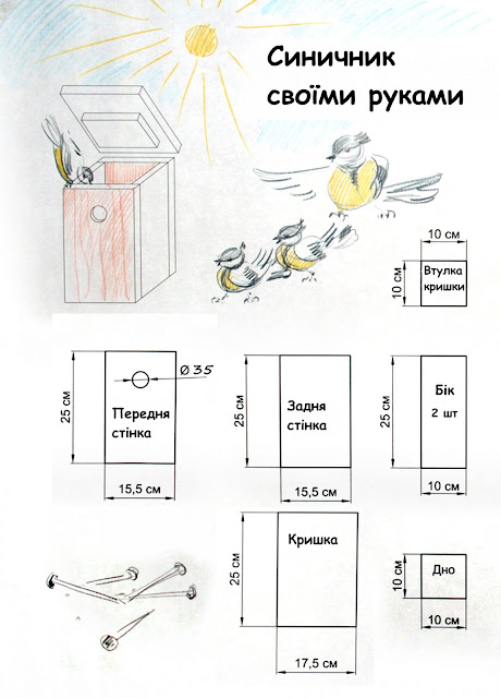 Для изготовления синичника для начала следует сделать чертёж с размерами. Также, мне понадобились следующие инструменты и материалы: