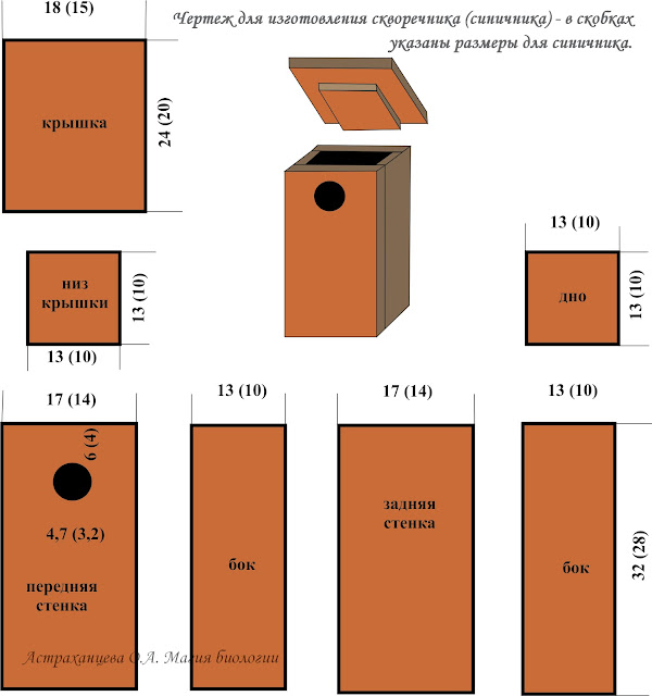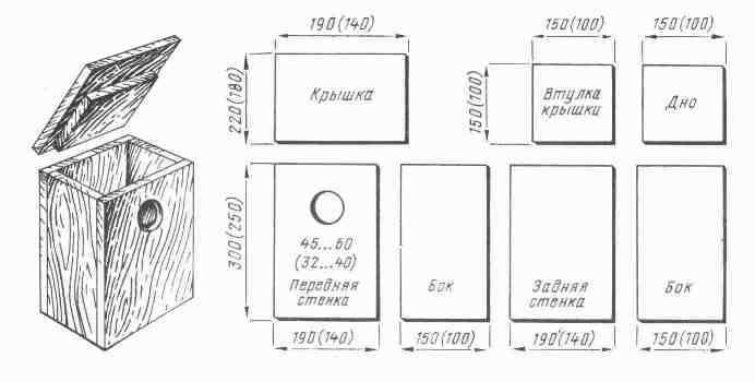 3. Оптимальные размеры синичника: высота — 350-400мм, ширина — 130-150мм, глубина — 170-200мм. Диаметр летка — 30-35мм. Расстояние от крыши до летка — 30-50мм. Выступ козырька крыши со стороны летка — 50мм.