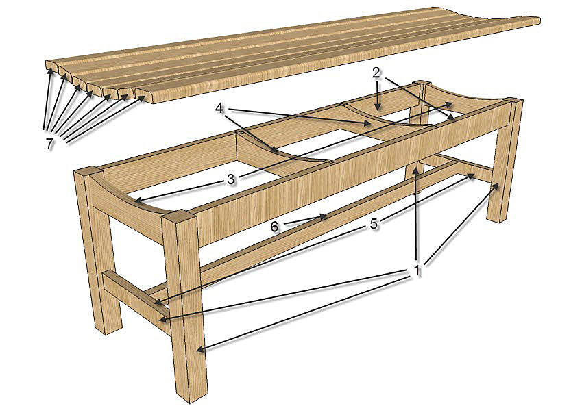 Вот более сложный вариант скамейки. Но он тоже достаточно прост, чтобы смастерить самостоятельно.