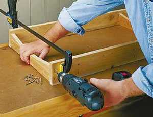 На участки в пятнадцать сантиметров наносится клей для дерева. К ним прикладывают доски, длина которых шестьдесят пять сантиметров. Дополнительно их крепят саморезами.