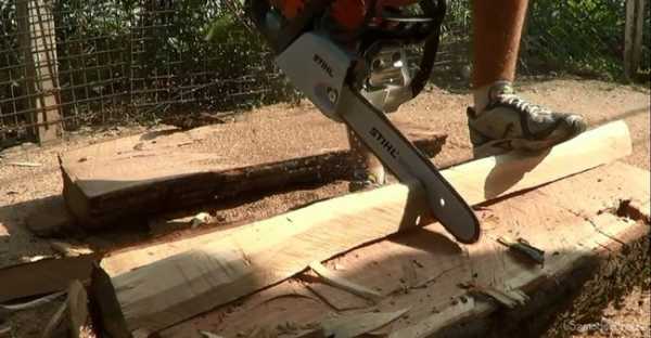 Бензопилой бревно распиливают вдоль по метке. Получившиеся неровности сразу срезаются все той же пилой.
