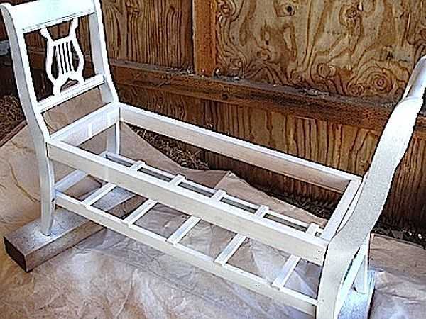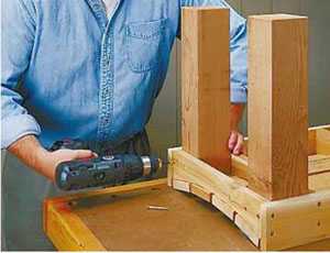 Для усиления конструкции и увеличения ее устойчивости делают нижнюю обвязку брусом по ножкам. Для спинки крепят две доски.