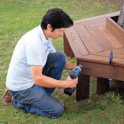 К получившейся основе присоединяют доски сидения. Шляпки саморезов желательно углубить.