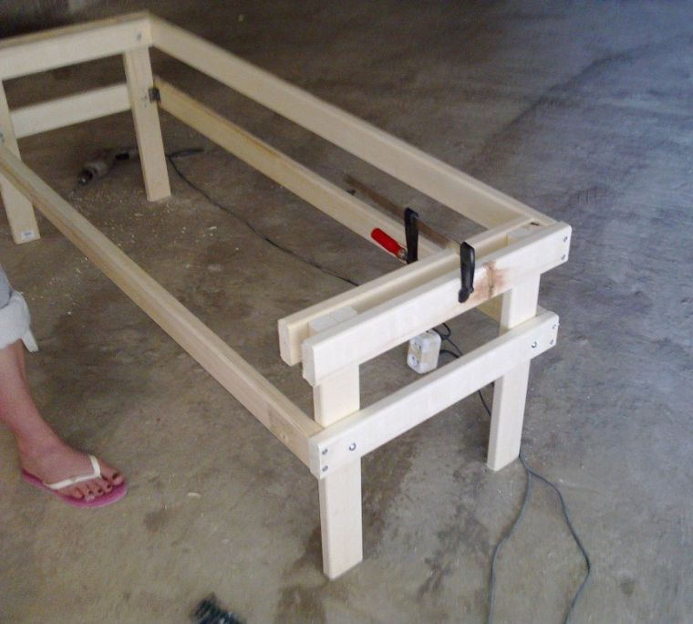- Саморезами прикрутите к каждой поперечной планке по две ножки. Поскольку данное соединение не будет контактировать с телом, металлические шурупы не смогут навредить, придется только защитить их от влаги.