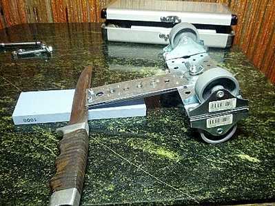 При заточке на таком приспособлении нож надо держать все время направленным строго вертикально. Это намного проще, чем удерживать его под определенным углом.