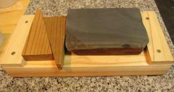 Самодельная приспособа для заточки ножей сделана из деревянных брусков. Получается она легкой, чтобы не двигалась с места, ее надо чем-то зафиксировать. Чтобы не держать рукой, можно использовать струбцины.