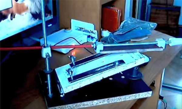 В данном варианте, как в ручной заточке, брусок неподвижный, а движется лезвие ножа, закрепленного на подвижной тележке. Угол задается высотой расположения бруска относительно площадки, на которой крепится лезвие. Особенность данного устройства — нужно чтобы стол был ровным. Это может быть столешница из натурального камня, можно на обычный стол положить стекло.