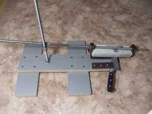 На верстаке, рядом с точилом крепятся направляющие, с помощью которых можно менять расстояние от упора для ножа до вращающегося круга. Этим расстоянием определяется угол заточки. Вертикальная штанга должна иметь свободный ход вверх-вниз с прочной фиксацией положения.