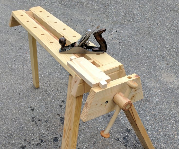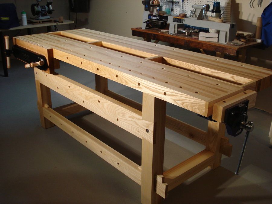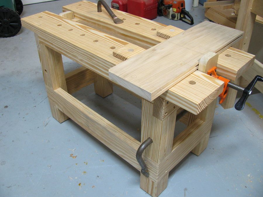 Причём сама работа выполняется как ручным инструментом (ножовкой, коловоротом и т. д.), так и механизированным – например, с помощью электрической дрели или электрорубанка. Столярный верстак имеет следующую типичную компоновку: