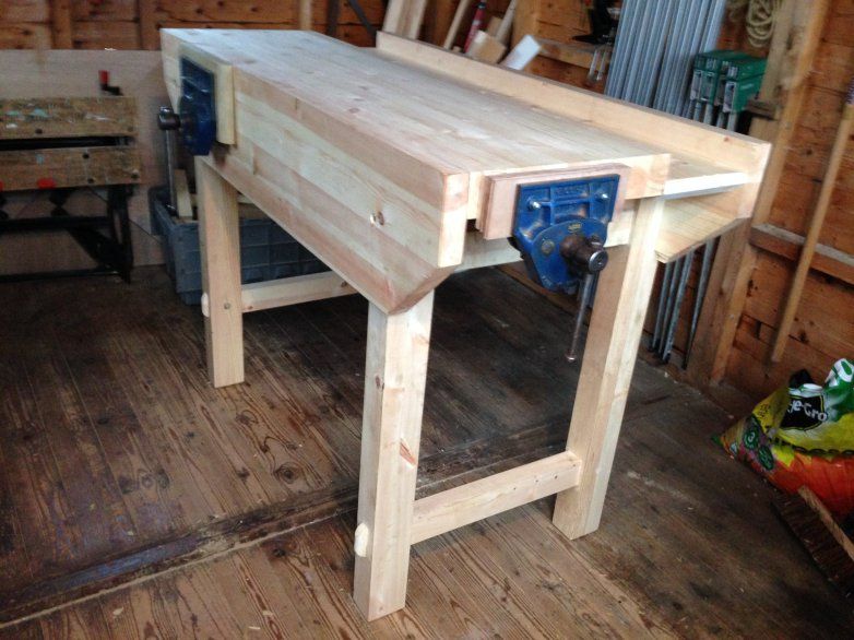 Размеры должны превышать ширина и длину основания на 3-5 см – это позволит со всеми удобствами чистить инструмент.Столешница прикручивается и прибивается к нескольким доскам, которые находятся с другой стороны рабочей поверхности, а в основании необходимо расположить пазы для монтирования брусков.Доски крепятся к устойчивому каркасуРабочий стол нужно привести в порядок с помощью шлифовальной машины, покрыть олифой для снижения риска получения травм от щепок, а к его основанию болтами прикручиваются металлические уголки.К уже сделанной рабочей поверхности крепим тиски, под которые следует создать углубления в рабочей поверхности, это позволит расположить вертикальную пластину в одну плоскость со столешницей.