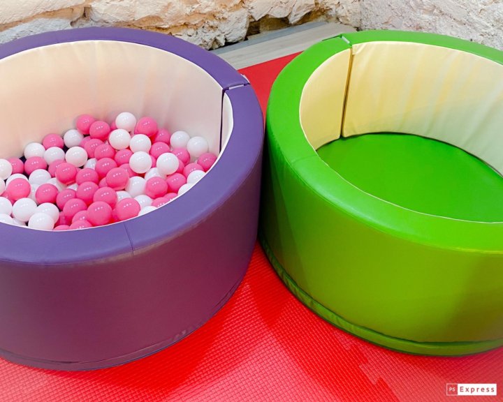 - Сухой бассейн может представлять модульную конструкцию, обтянутую плотным текстилем. Безопасность детям в процессе игр здесь также гарантирована.