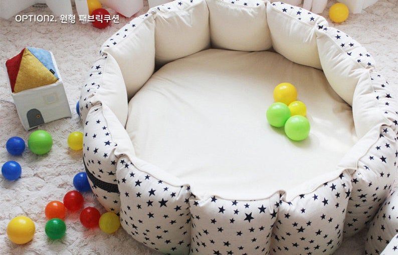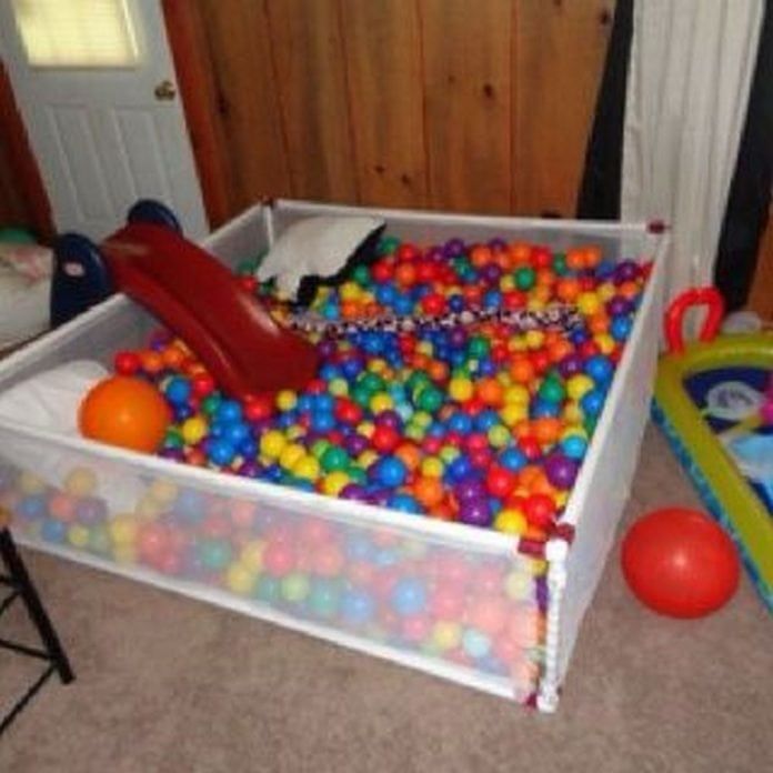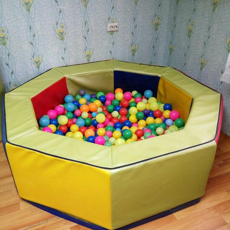 Бассейн с шариками обустраивается по принципу детского манежа. Его стенки выполняются из материала, который не представляет угрозы для здоровья малыша в случае резкого соприкосновения.