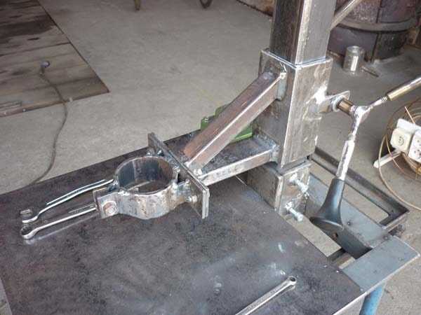 Для изготовления механизма регулировки применяют разные способы, в данном случае сделан тросиковый привод, для чего нужно изготовить скобу для крепления и вращающийся барабан. Для крепления петли тросика в основу приваривается болт. Рукоятку можно сделать любую, из подручных материалов, главное, чтобы удобно было пользоваться. Для фиксирующего устройства использовалась обычная струбцина, закрепленная на металлической пластине. После завершения работы покрасьте все детали, чтобы защитить от ржавчины, а трущиеся поверхности смажьте технической смазкой.