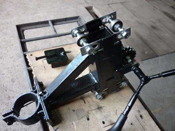 Каретка с патроном и кронштейном для двигателя, дополнительно опирается двумя подшипниками на штангу из профиля. Это делается для компенсации люфта рулевой рейки.