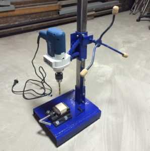 Данный станок можно назвать универсальным, так как по этому проекту вы можете изготовить различные варианты по размерам и производительности. Для этой стойки подойдет любая ручная дрель вне зависимости от мощности. Конечно, представленные выше самодельные модели из дерева сделать легче, но металл, само собой, надежней, хотя без сварочного аппарата не обойтись. Для изготовления понадобится металлическая пластина для основы и уголки для подставок.