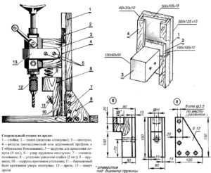 На фото схемах и чертежах показаны основные типы конструкций самодельных сверлильных станков, на которых применяется дрель.