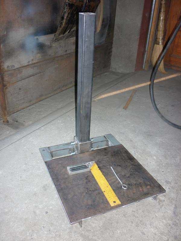 Станина сварена из стальной пластины 4 мм и аналогичных уголков. Строго вертикально приваривается несущая штанга из металлического профиля. На горизонтальной поверхности проделываем 6 отверстий для крепления тисков или опорной подставки. С обратной стороны навариваются гайки.