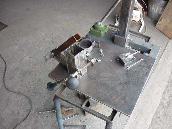 Из подходящих уголков собираем каретку, на которой будет закреплен рабочий вал и двигатель. Особое внимание уделяем размещению опорных поверхностей для упорных подшипников. Нагрузка должна быть распределена равномерно, иначе один из подшипников износится быстрее.