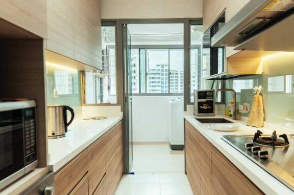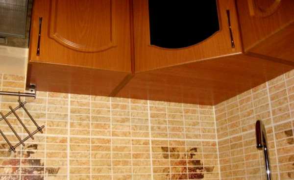 - Если потолки достаточно высокие, можно разместить над верхними шкафами;
