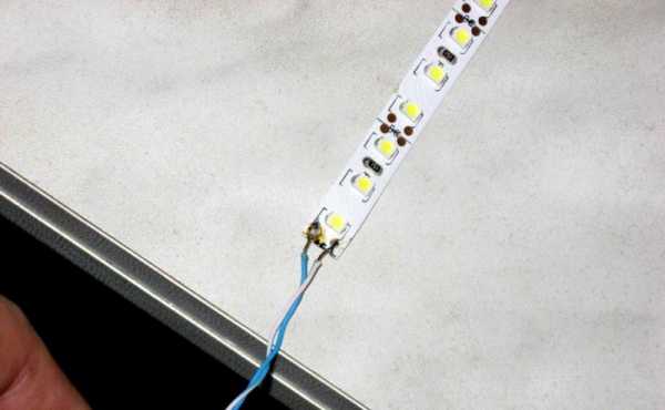 Поверхности обезжиривают- При необходимости лента разрезается на отрезки нужной длины. С каждой стороны оголяются провода на полтора сантиметра, к ним припаивается кабель. Все места спайки защищаются несколькими слоями изоленты.