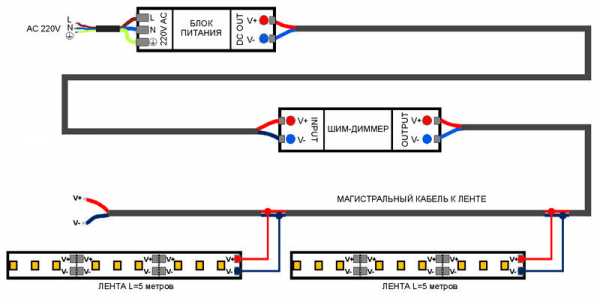 Схема подключения диодной ленты- Покупая дюралайт, следует обсудить с продавцом мощность источника питания и приобрети блок, подходящий для выбранной ленты.