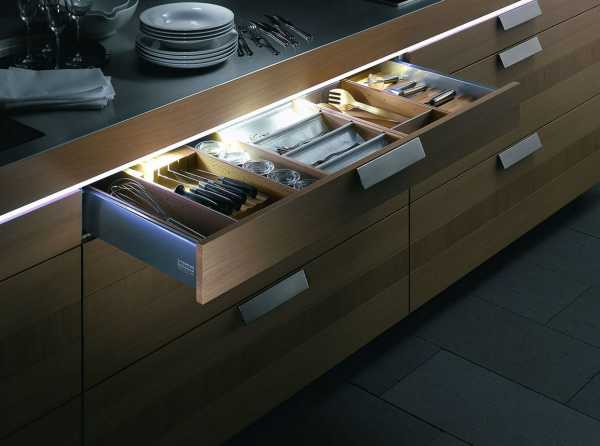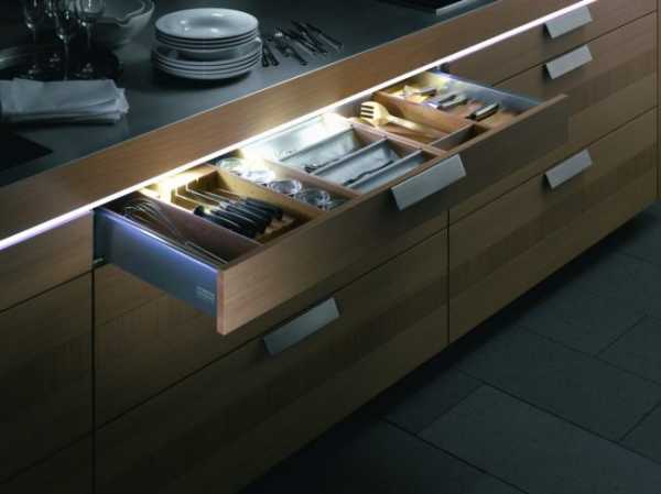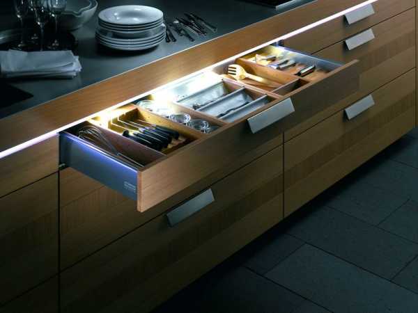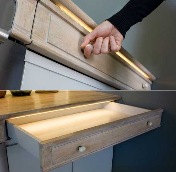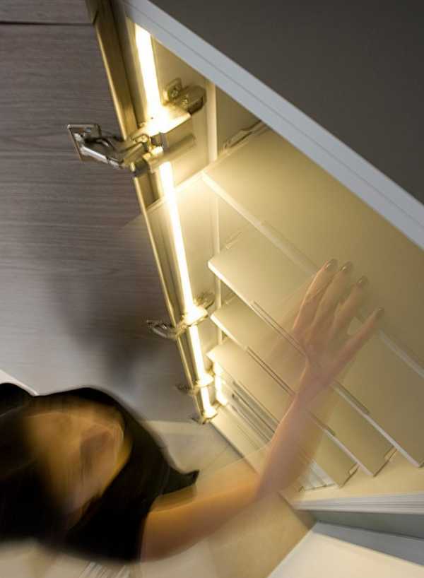 - для иллюминации внутри ящиков и кухонных шкафов;