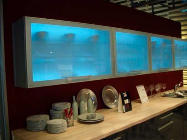 Существуют специальные мебельные ленты, которые можно устанавливать сразу за дверцы, при этом владелец получает приятное мягкое свечение. Благодаря небольшому весу, конструкция не отстанет от поверхности.