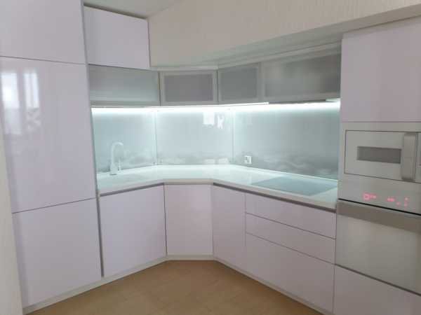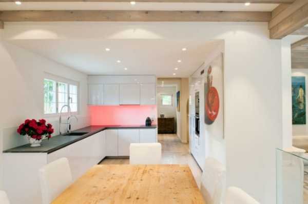 Красная подсветка фартука в белоснежной глянцевой кухне