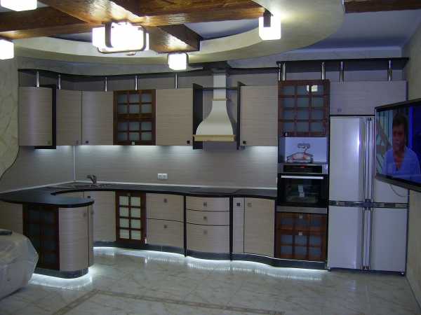 Комбинирование осветительных приборов обеспечит кухню полноценной иллюминациейК сведению! Встроенные светильники делают помещение визуально выше. Того же эффекта можно добиться, размещая светодиодную ленту по периметру над потолочным плинтусом или подсветку для кухни над шкафами.