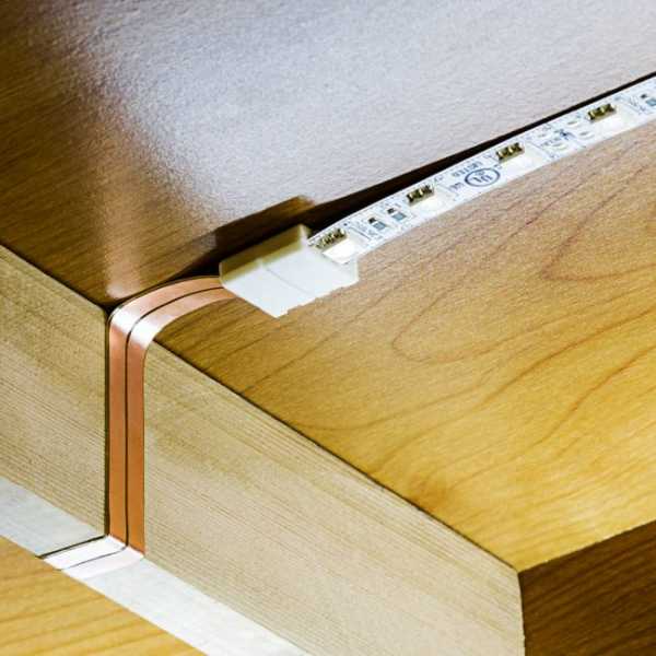 Крепление кабеля- На выбранную поверхность полок наклеивается двусторонний скотч и прикрепляется лента. В большинстве случаев на ленте уже есть липкий слой, но он недостаточно надёжен. Перед закреплением ленты кабель крепится к трансформатору. Необходимо проверить нижнее напряжение прибора перед установкой. Соответственно, следует помнить, что при монтаже проводов минус крепится к минусу, плюс к плюсу.