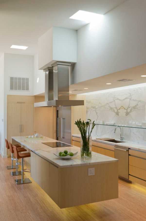 С помощью cветодиодной подсветки удается создать равномерную подсветку рабочей зоныДля того чтобы работа по приготовлению пищи на кухне была более быстрой и уверенной столешницу и кухонную плиту нужно подсветить. Очень часто можно встретить подсветку под шкафами, которая очень хорошо спрятана или замаскирована. Для этих случаев используют люминесцентные или светодиодные лампы, которые могут обеспечить ярким светом, причем последние уже смогли завоевать потребительские сердца.