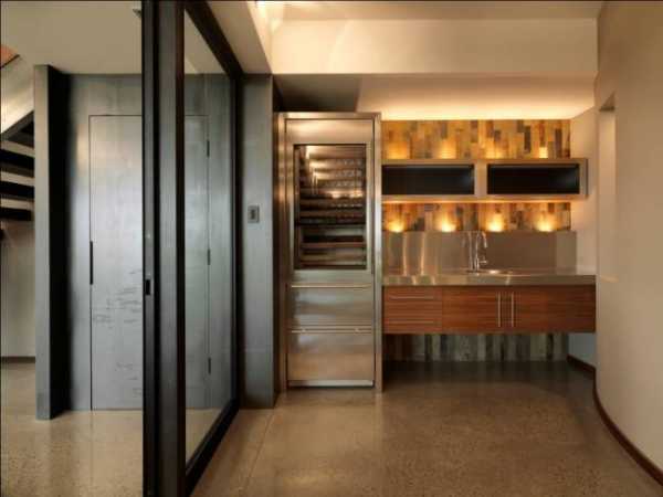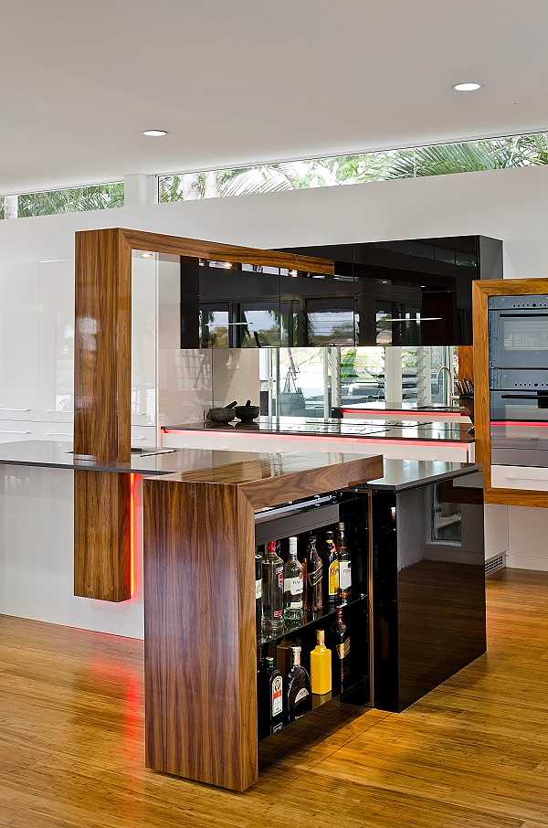 Совет! Чтобы яркие светодиоды не мешали сидящим за обеденным столом людям, на край полок можно установить планки-плинтусы или использовать встроенные приборы, утопленные в поверхности шкафа с двойным дном.