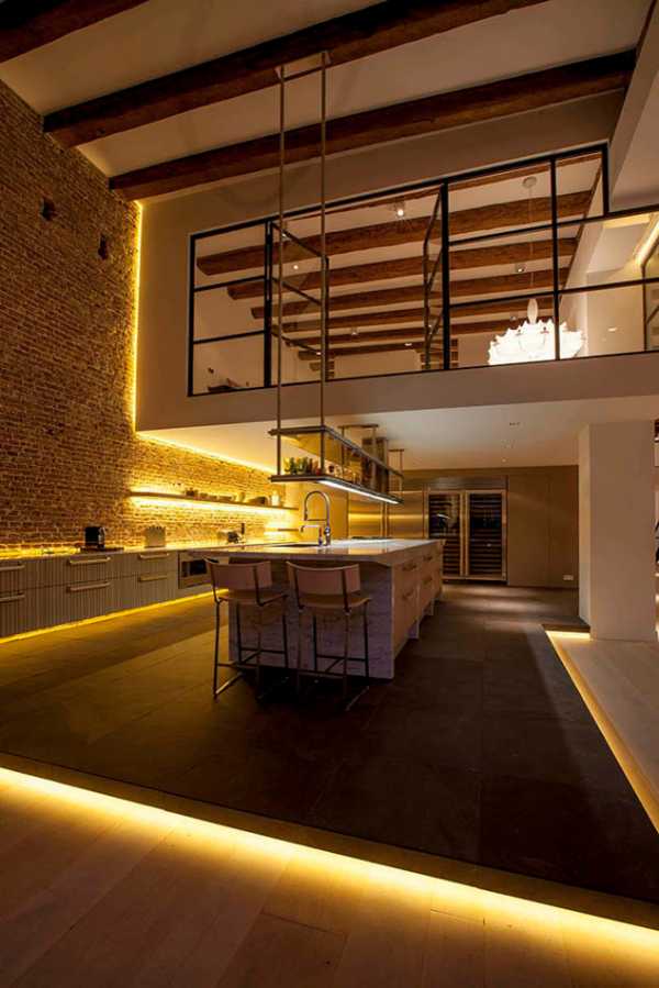 Контурная декоративная подсветка подиума, мебели и полок в кухне-лофт