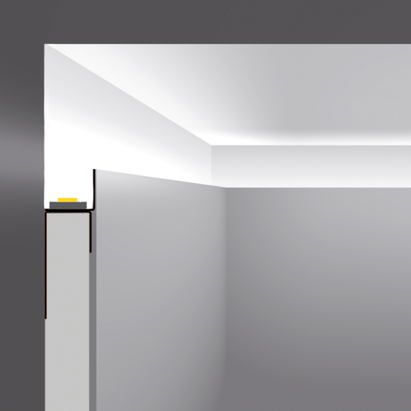 Светодиодный профиль полностью вмещает светодиодную ленту. Свет проходит через рассеянную поверхность, создавая прекрасный эффект свечения по комнате.