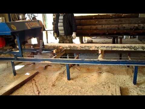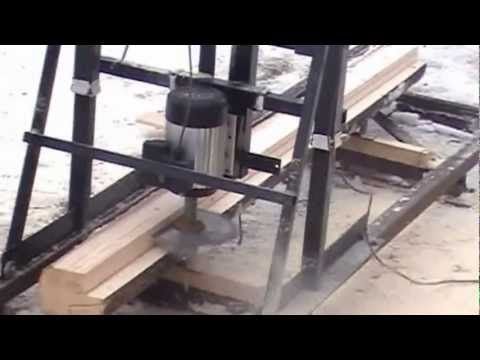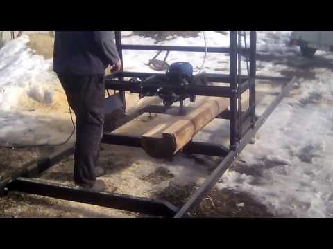 Бензопила движется по направляющей и проходит через бревно, поворачивая рукоятку, которая наматывает тяжелый шнур, прикрепленный к дальнему концу направляющей. Эта простая система удобна в использовании и позволяет производить неизменно прямые плоские доски. Распиленная поверхность на удивление гладкая для распила бензопилой и примерно того же качества, что и доски, распиленные на коммерческой циркулярной пилораме.