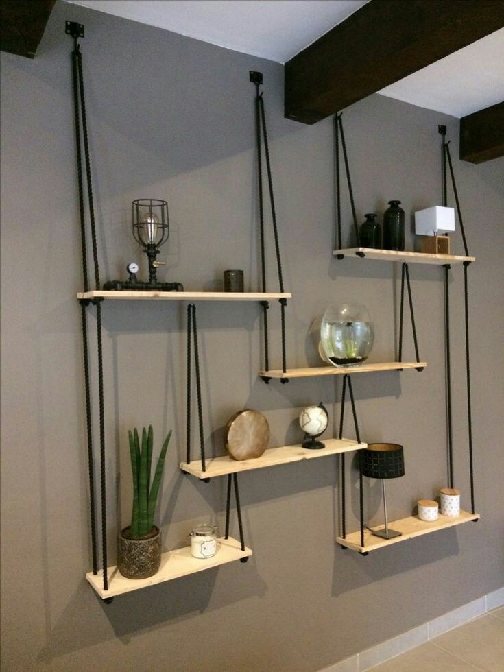 Посмотрите на фото ниже, и вы поймете, о чем идет речь. Главное в этой конструкции – правильно и надежно закрепить сами ремни к стене. А уже к ним прикрепить деревянные полки, можно саморезами с широкими шляпками. Здесь надо определиться с количеством полок и с их размерами, особенно с количеством, потому что это будет влиять на длину используемого ремня.